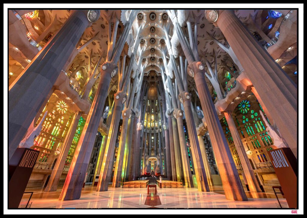 Lo más impactante al entrar es que no parece una catedral gótica tradicional, es un bosque de piedra. Las columnas no son simples pilares, no son rectas; se inclinan y se dividen en ramas como si fueran árboles de un bosque gigante que sostienen el techo, creando una sensación de naturaleza infinita. No hay cuadros en las paredes en su lugar Gaudí colocó las vidrieras de colores de forma estratégica. Por la mañana, los tonos azules y verdes bañan el templo (el amanecer), y por la tarde, los rojos y naranjas crean una atmósfera cálida (el atardecer) transformando el interior cada día.